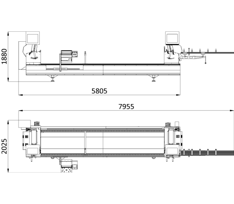 La tête gauche est fixe et la tête droite se positionne automatiquement à la longueur souhaitée. La tête droite est équipée d’un convoyeur à rouleaux pour le soutien du profilé. Le profilé est serré à la fois verticalement et horizontalement par deux serre-joints pneumatiques réglables. Après la fermeture des capots de protection, les lames de scie se déplacent automatiquement de l’arrière vers l’avant.