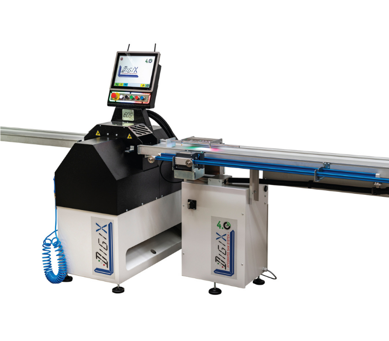 De zaagmachine type TM-DIGI-X is een automatische zaagmachine geschikt voor het gelijktijdig zagen van 2 pvc glaslatten met geïntegreerde lengteaanslag. De zaagmachine heeft zaagbladen in X-positie op 45° en 135° en elk is uitgerust met een zaagblad D250 mm voor het zagen en een zaagblad D155 mm voor het afwerken.
