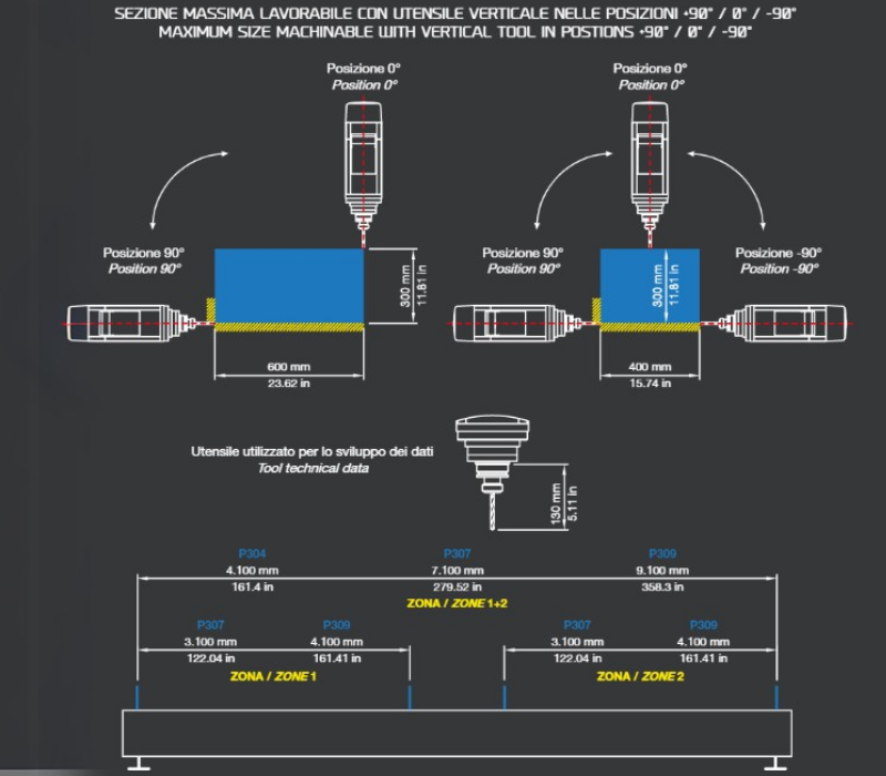 De machine is beschikbaar in 3 uitvoeringen met bewerkingslengte 4.000 mm / 7.000 mm / 9.000 mm met twee verschillende werkzones: een enkele werkzone of de pendulaire modus met twee afzonderlijke werkzones.